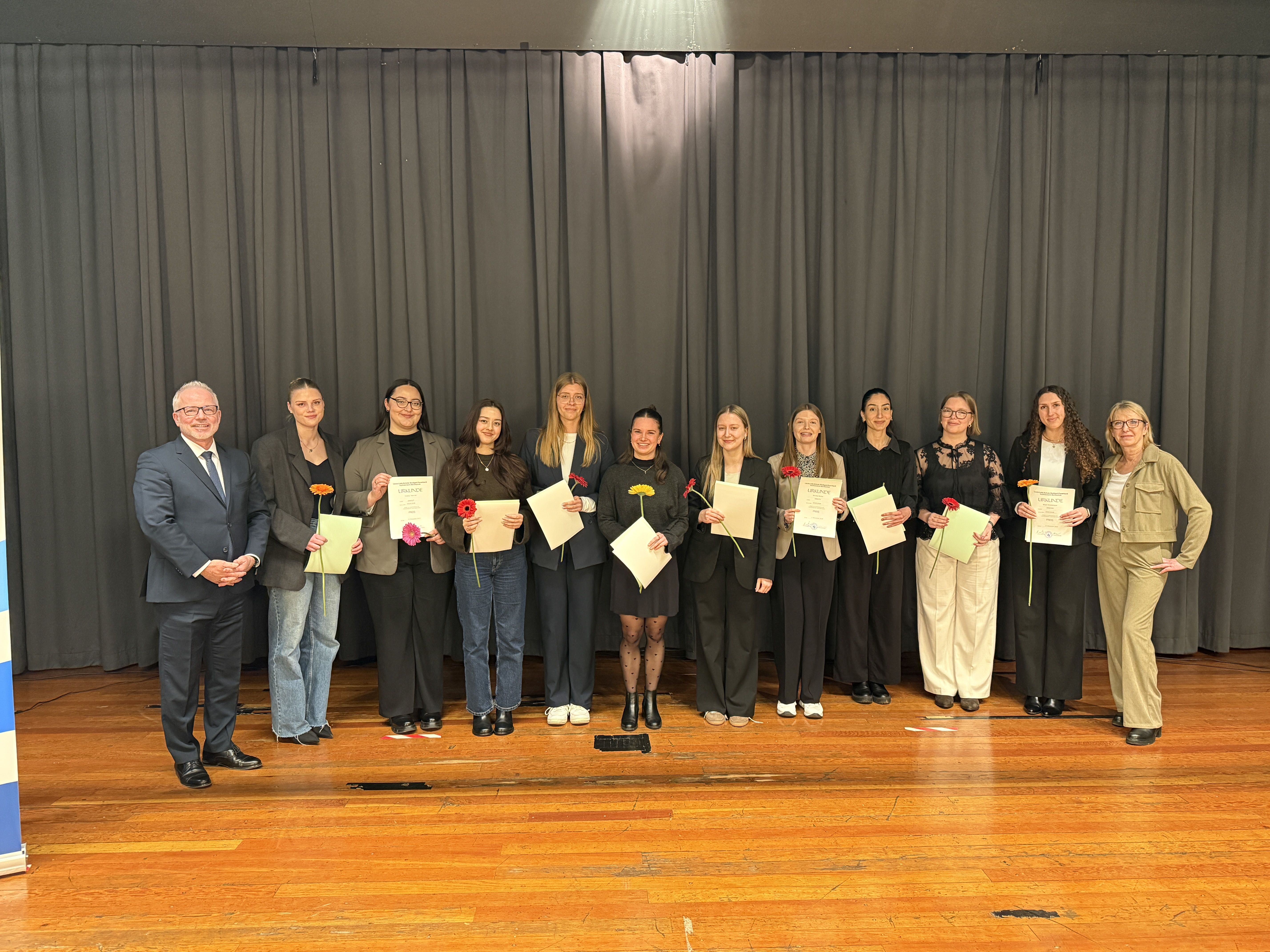 Im Rahmen der anschließenden Zeugnisübergabe wurde zahlreiche Absolventinnen und Absolventen mit Preisen und Belobigungen auszeichnet. 11 Schülerinnen erhielten Preise für ihre herausragenden Leistungen. Sie erzielten eine Abschlussnote von 1,5 oder besser. Darüber hinaus erhielten 41 Schülerinnen und Schüler eine Belobigung für einen Notendurchschnitt von 2,0 oder besser.