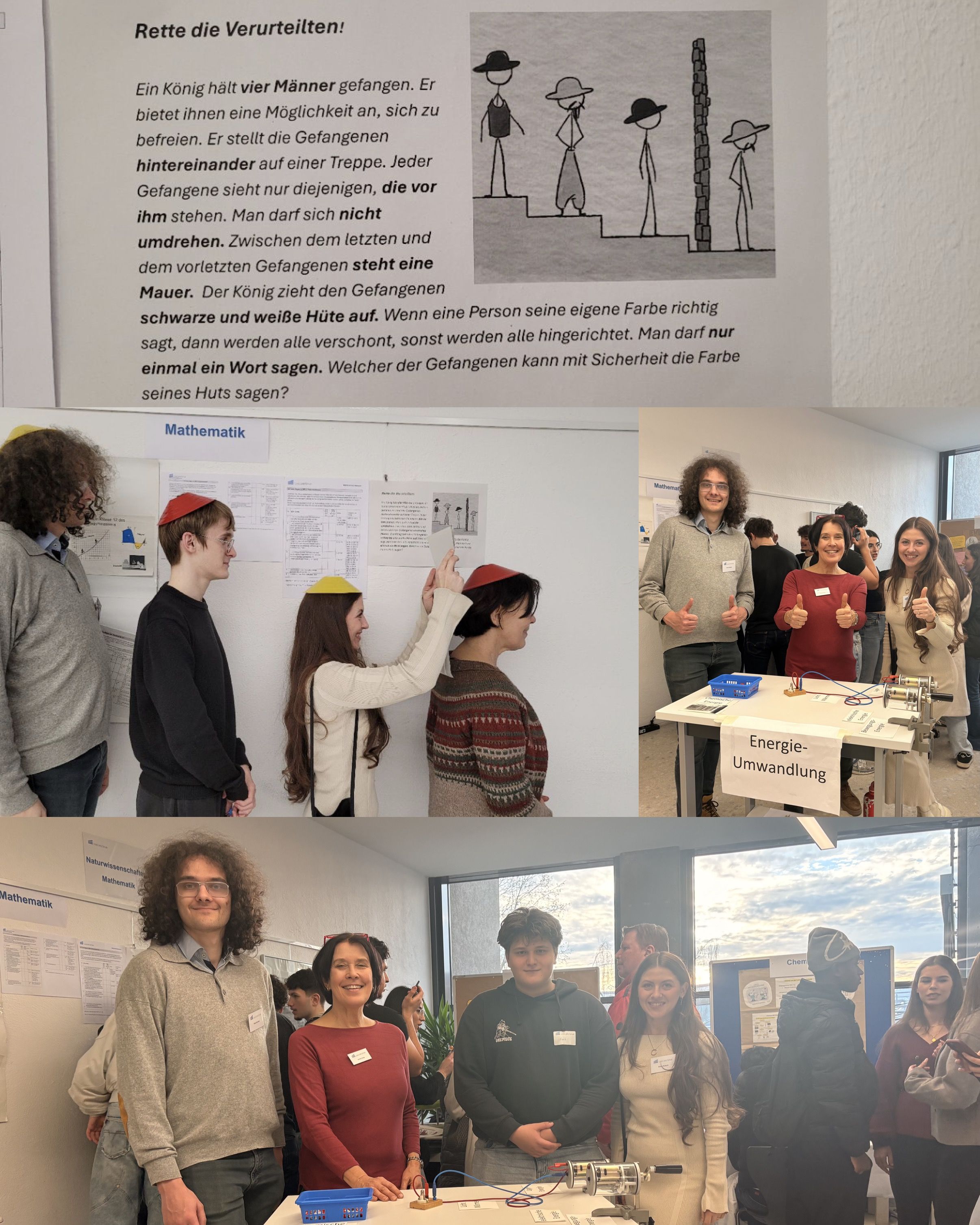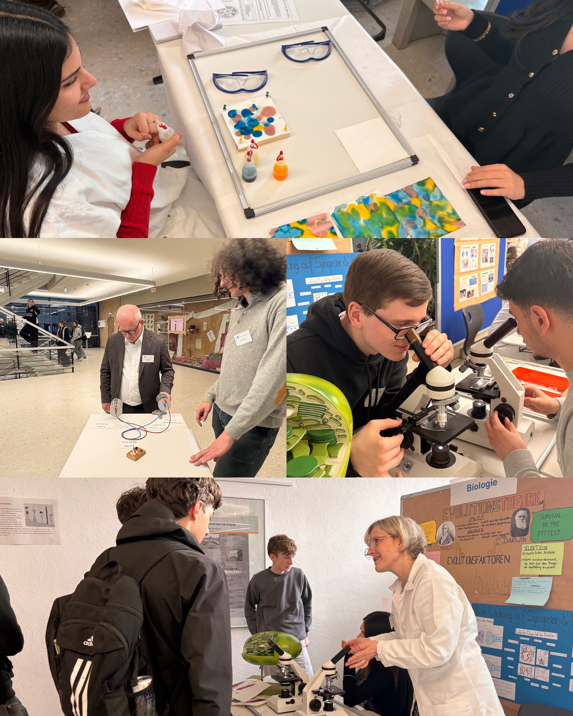 Die sprachlichen Fächer Spanisch, Französisch und Deutsch sowie das Fach Privates Vermögensmanagement präsentierten sich gemeinsam mit den Lehrkräften anhand anschaulich gestalteter Plakate 🌍🗣️. Ergänzt wurde das Angebot durch ein Schulquiz der SMV 🎲. Auch die Naturwissenschaften sowie die Fächer Mathematik, Informatik und Sport luden mit vielfältigen Mitmachaktionen zum Ausprobieren ein 🔬💻🏃♂️ – darunter die Erstellung eines chemischen Kunstwerks 🎨 oder erste Schritte im Programmieren. Der Seminarkurs „Film“ bot die Möglichkeit, Fotos vor einem Greenscreen aufzunehmen und beim Schnitt eines Films zuzusehen 🎬.