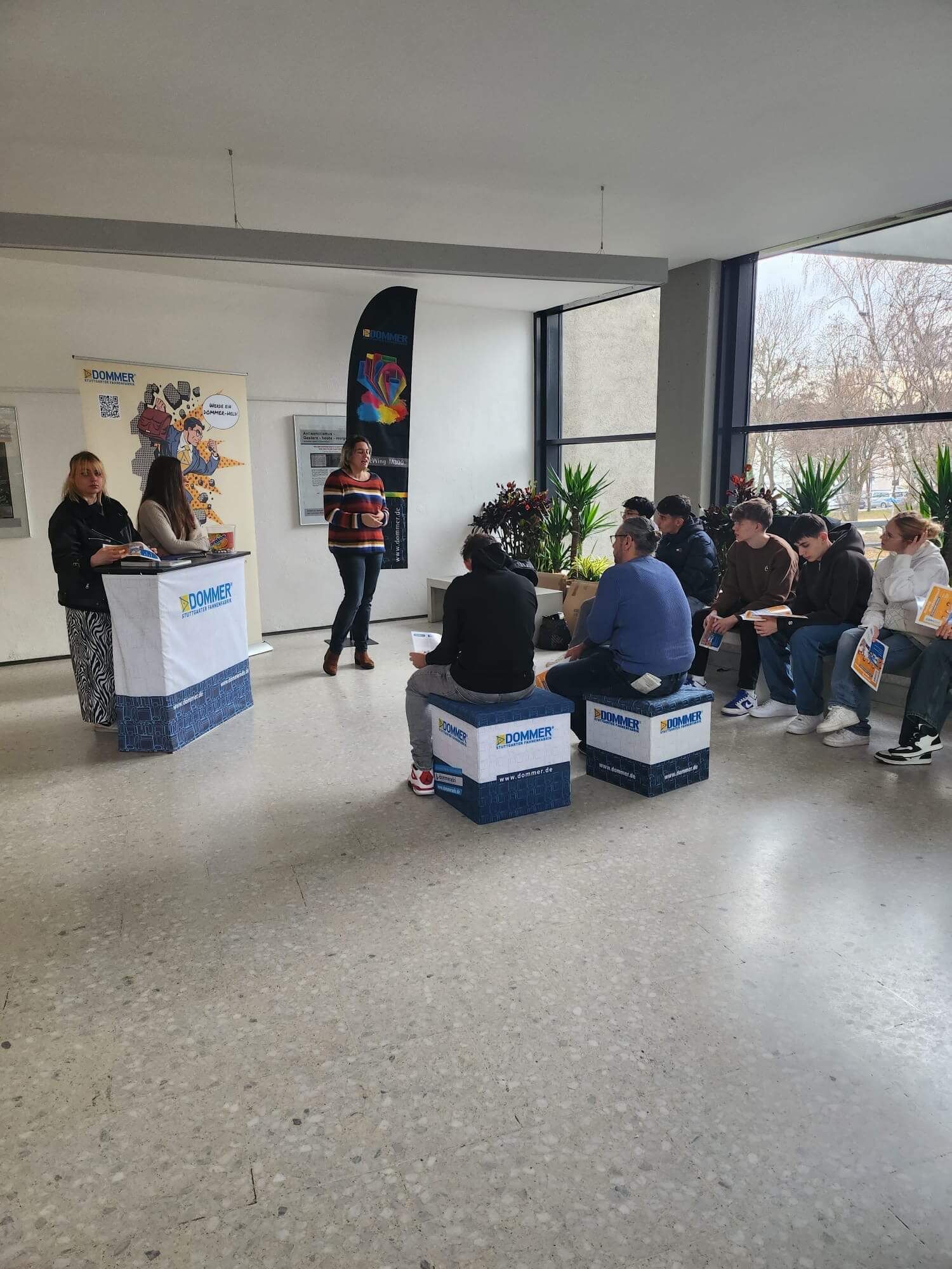 In ihrem Rundgang durch die Klassenzimmer konnten die Besucherinnen und Besucher mit Auszubildenden unserer Berufsschule sowie mit unseren Wirtschaftsgymnasiastinnen und Wirtschaftsgymnasiasten sprechen und an verschiedenen Aktivitäten der Berufsorientierung teilnehmen. Die Besucherinnen und Besucher erhielten von unseren Berufsschülerinnen und Berufsschülern Informationen über ihre Ausbildungsberufe und wertvolle Tipps für Vorstellungsgespräche. In einem Speed-Dating mit unseren Schülerinnen und Schülern des Wirtschaftsgymnasiums wurden wichtige Fragen rund um das Wirtschaftsgymnasium beantwortet. Darüber hinaus stellten sich die Dommer Stuttgarter Fahnenfabrik GmbH und die Stuttgarter Straßenbahnen AG (SSB) an Infoständen als potentielle Ausbildungsbetriebe vor.