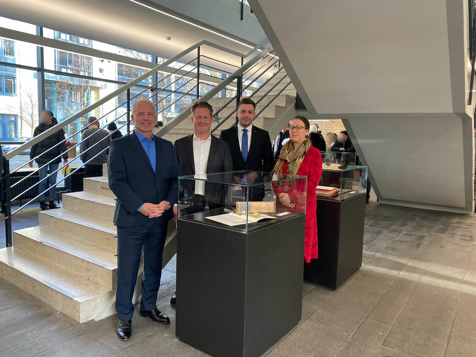 Von links nach rechts: Marc van Bergen (Schulleiter), Dr. Christian-Titus Klaiber (Geschäftsführer Louis Leitz Family Office GmbH & Co. KG), Johannes Heberle (Bezirksvorsteher Bezirksamt Feuerbach), Janine Michler-Roy (Kulturbeauftragte LLS)