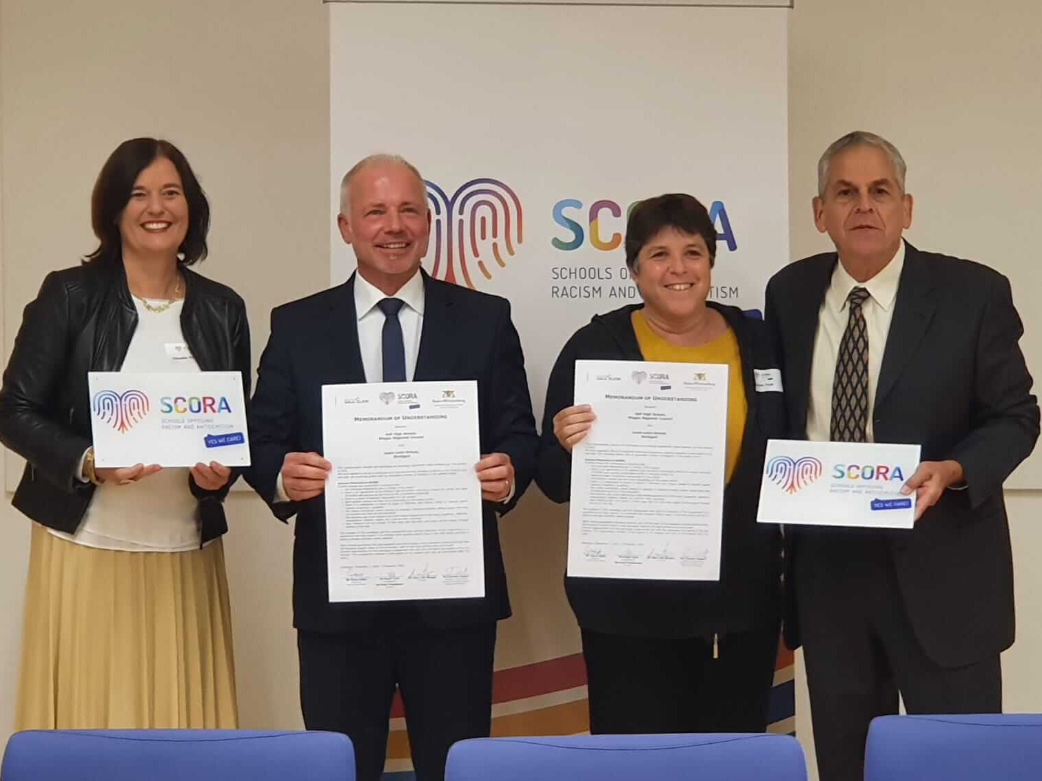 Von links nach rechts: Claudia Rugart (Abteilungspräsidentin Schule und Bildung, Regierungspräsidium Stuttgart), Marc van Bergen (Schulleiter der Louis-Leitz-Schule), Noah Tzuk (Misgav Regional Council) und Giora Saltz (Chairman County Upper Northern Galilee) nach Unterzeichnung des Memorandums