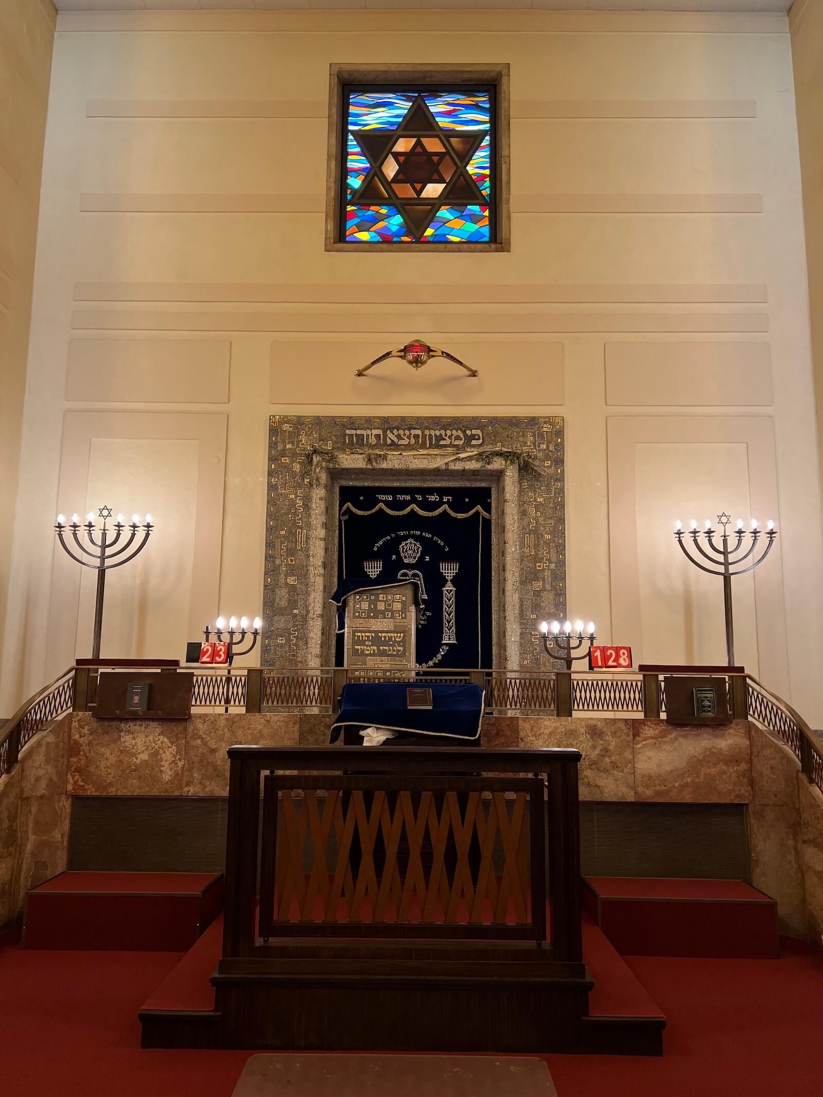 Am 31.03.2022 machte sich der Seminarkurs Israel gemeinsam mit den betreuenden Lehrkräften Frau Seidel, Frau Bürkle und Herrn van Bergen auf zur Synagoge in Stuttgart, um dort das Vorstandsmitglied der jüdischen Gemeinde Herrn Kashi zu treffen und die im Unterricht gelernten Dinge hautnah zu erleben. Zunächst einmal führte uns Herr Kashi in die Geschichte der Synagoge in Stuttgart ein, die um das Jahr 1860 erstmals erbaut wurde, dann allerdings in der Nacht zum 10. November 1938 von den Nationalsozialisten zerstört und 1951 wieder aufgebaut wurde. Durch die Unsicherheit der Stadt, ob diese Synagoge wirklich dauerhaft genutzt werden würde, wurde sie aufgebaut wie ein Kino, um sie gegebenenfalls umzubauen.