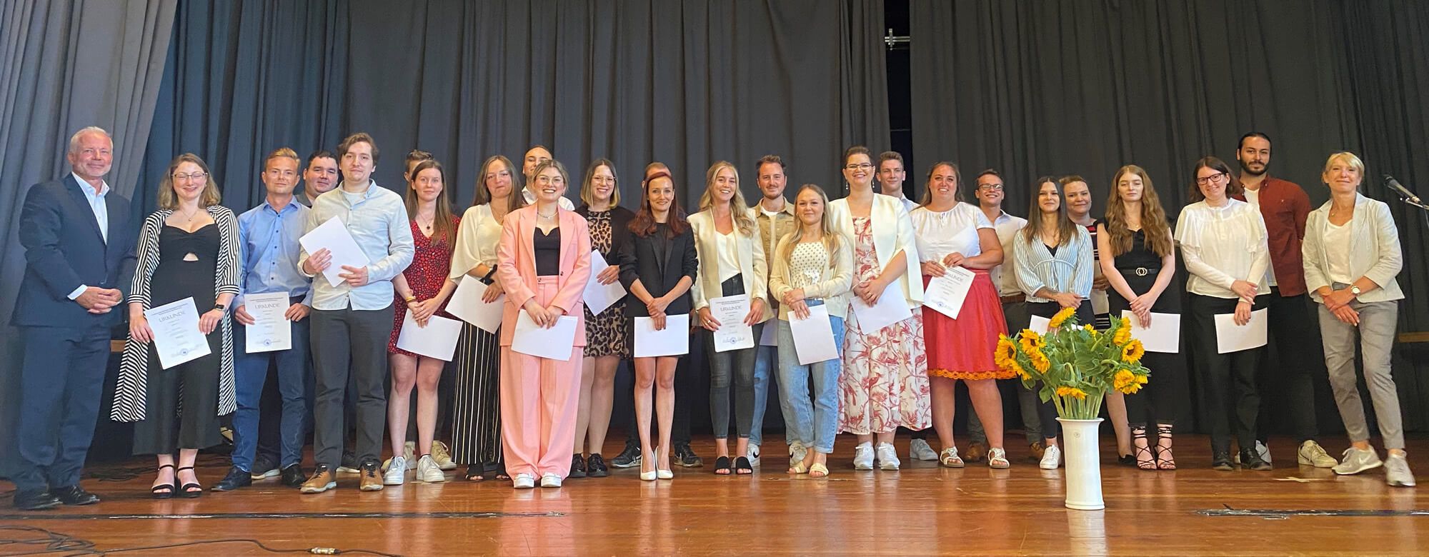 Anschließend wurden die Zeugnisse klassenweise von Berufsschulabteilungsleiterin Frau Schellhammer und den jeweiligen Klassenlehrerinnen und Klassenlehrern überreicht. Eine besondere Ehrung erhielten 25 Schülerinnen und Schüler, die eine Abschlussnote von 1,5 oder besser erlangen konnten (siehe Bild). Als besondere Wertschätzung ihrer Leistung wurden ihnen Preise von Herrn van Bergen überreicht.