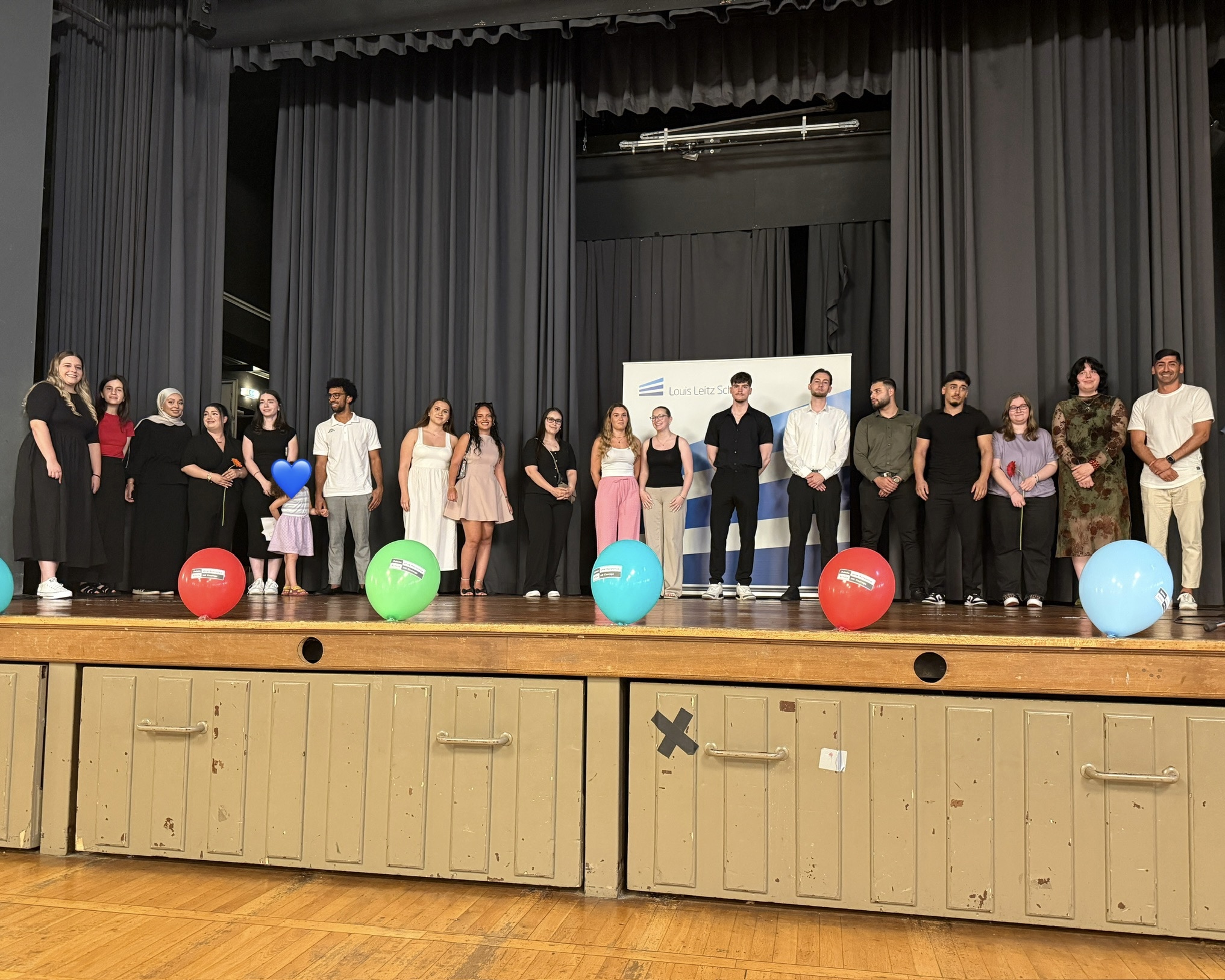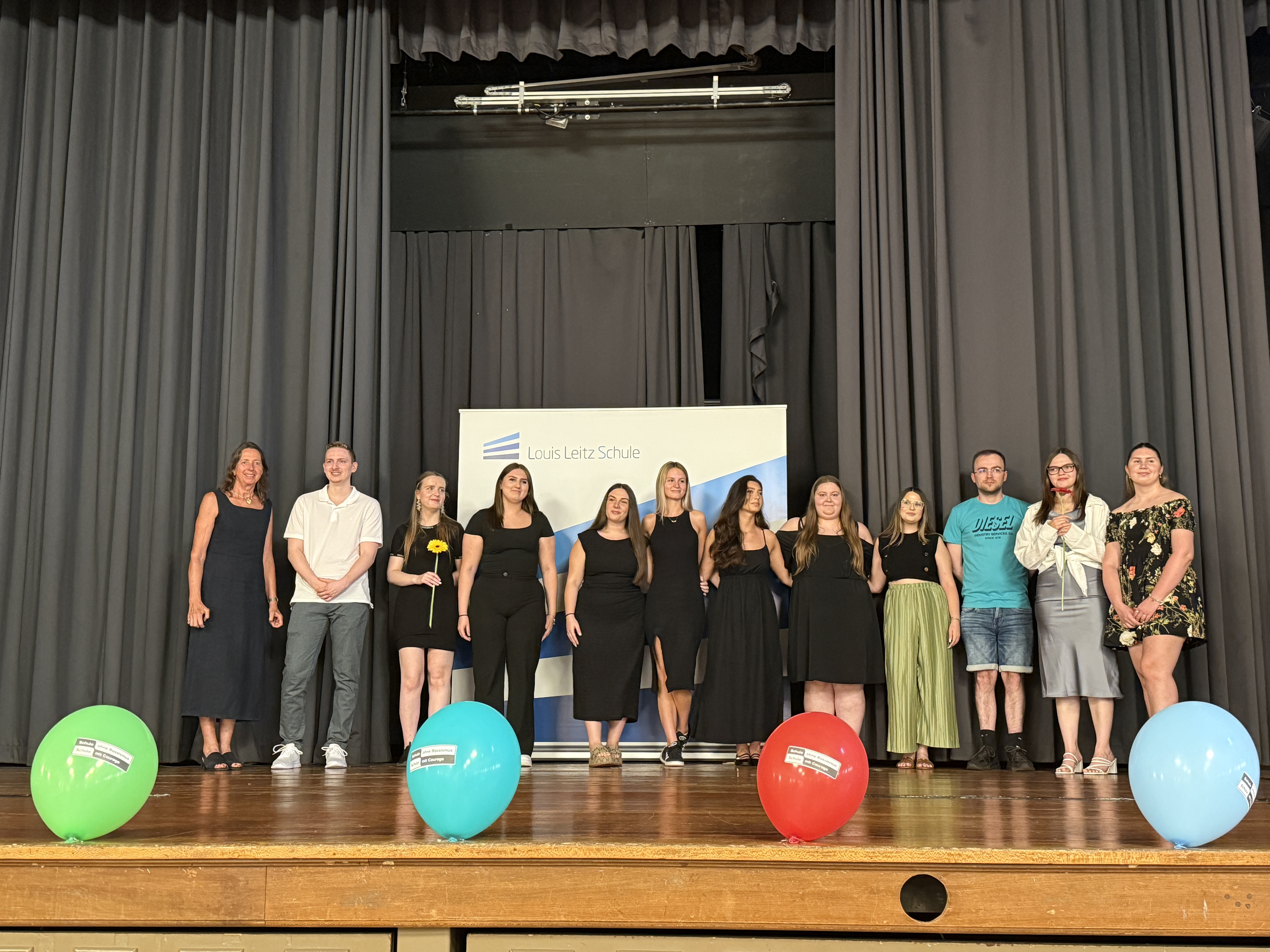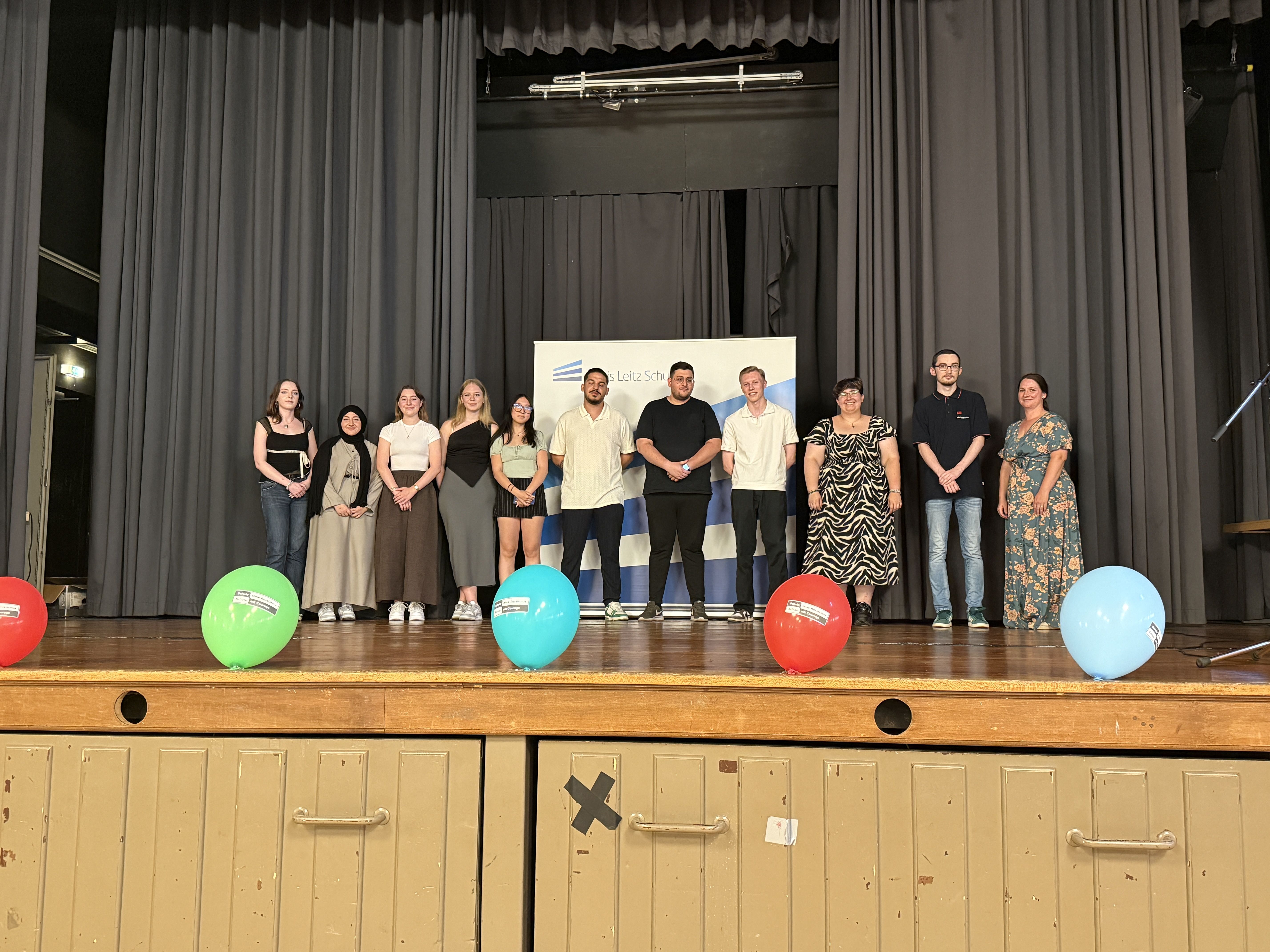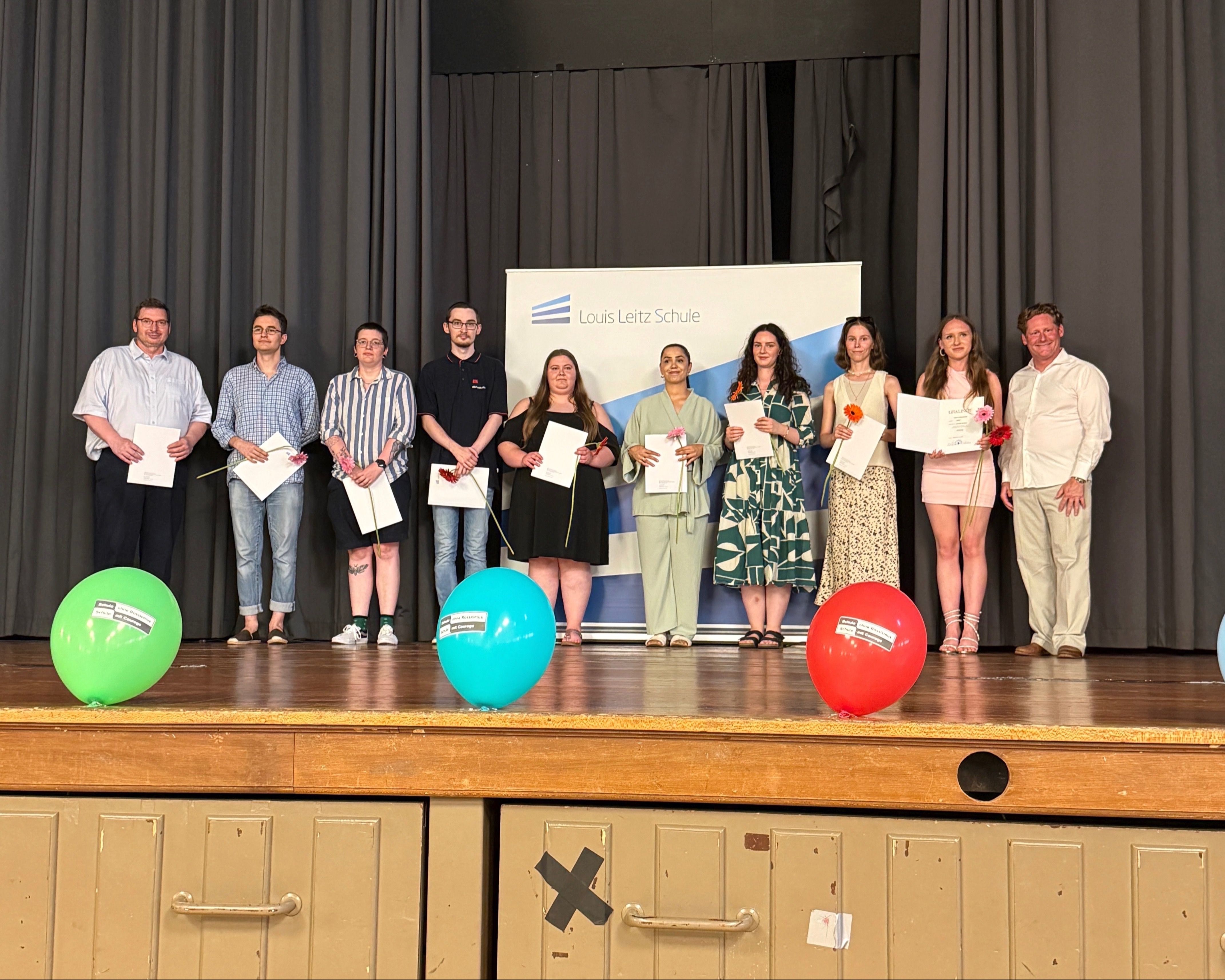 Herr Link berichtete in seiner Rede, dass dieser Erfolg auch zahlenmäßig belegbar sei, lag doch die Bestehensquote des Ausbildungsberufs Personaldienstleistungskauffrau /-mann bei 100 %. Ähnlich erfreuliche Quoten konnten für die Ausbildungsberufe Kauffrau /-mann für Büromanagement und Industriekauffrau /-mann vermeldet werden. Zudem zeigte sich der Erfolg durch die Aushändigung von acht Preisen und 27 Belobigungen. Die Absolventinnen und Absolventen wurden in der Rede zudem ermutigt, für ihre Werte einzustehen, eine Gemeinschaft zu sein und die Vielfalt zu schätzen und zu respektieren. Durch das Nutzen der eigenen Fähigkeiten sowie des eigenen erworbenen Wissens, könne eine positive Veränderung in der Gesellschaft herbeigeführt werden. Dies geht auch mit dem Versprechen der Louis-Leitz-Schule einher, sich aktiv gegen Rassismus und Diskriminierung einzusetzen. Ein Versprechen welches durch die Auszeichnung zur „Schule ohne Rassismus – Schule mit Courage“, welche zu Beginn der Abschlussfeier erfolgte, verdeutlicht wurde. Zum Abschluss seiner Rede erinnerte Herr Link daran, dass jede Absolventin und jeder Absolvent das Potenzial haben, Großes zu erreichen.
