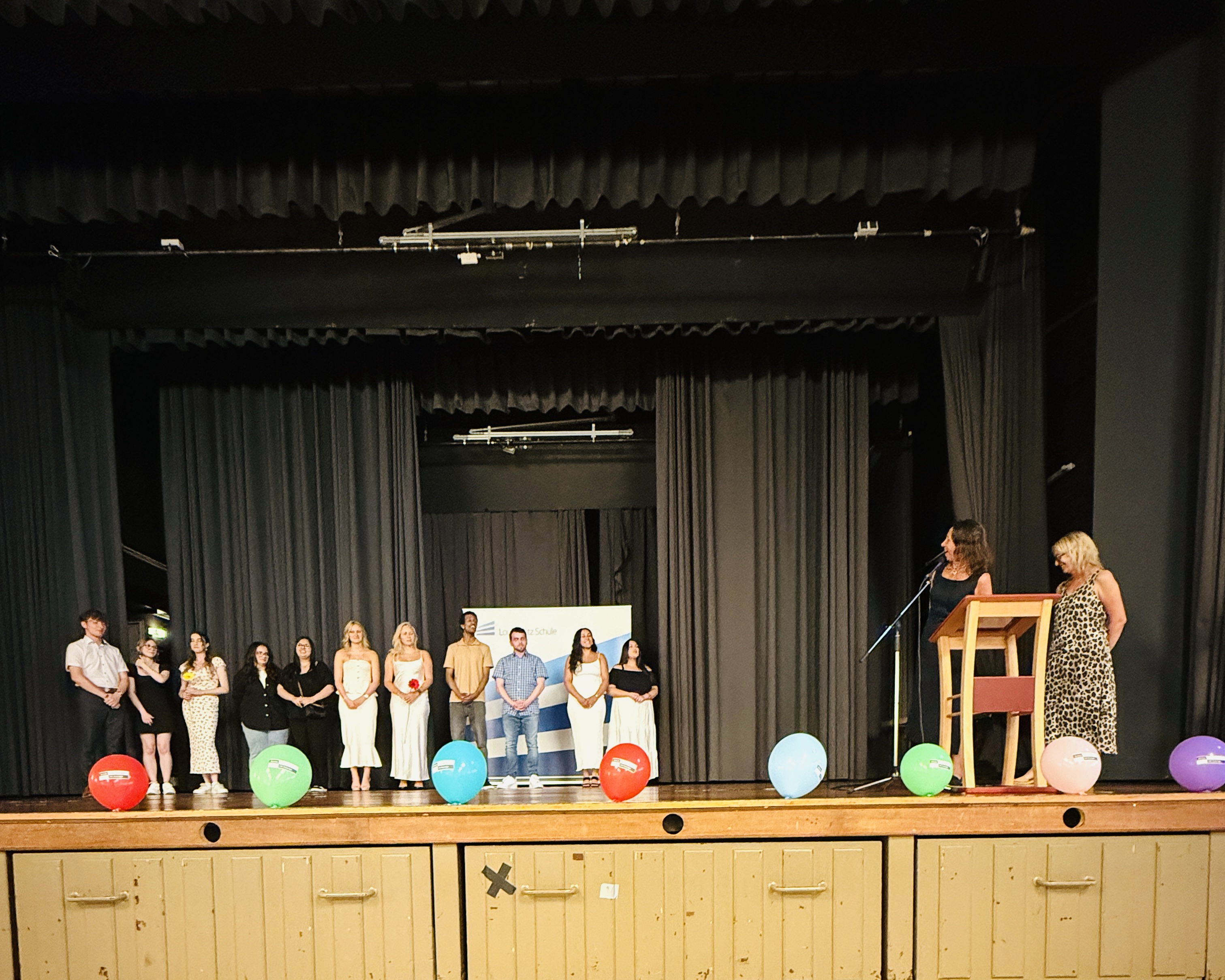 „Der einzige Weg, großartige Arbeit zu leisten ist, zu lieben, was man tut.“. Mit diesem Zitat des amerikanischen Unternehmers und Gründers Steve Jobs, eröffnete der stellvertretende Schulleiter, Herr Stephan Link, die Abschlussfeier der Berufsschule. Gemeinsam mit Freunden, Eltern und Angehörigen, Lehrerinnen und Lehrern sowie Vertreterinnen und Vertretern der Betriebe, hatten sich die Berufsschulabsolventinnen und -absolventen am 01. Juli 2025 in der Feuerbacher Festhalle eingefunden. Gemeinsam wurde ein besonderer Moment erlebt und der Erfolg gefeiert.
