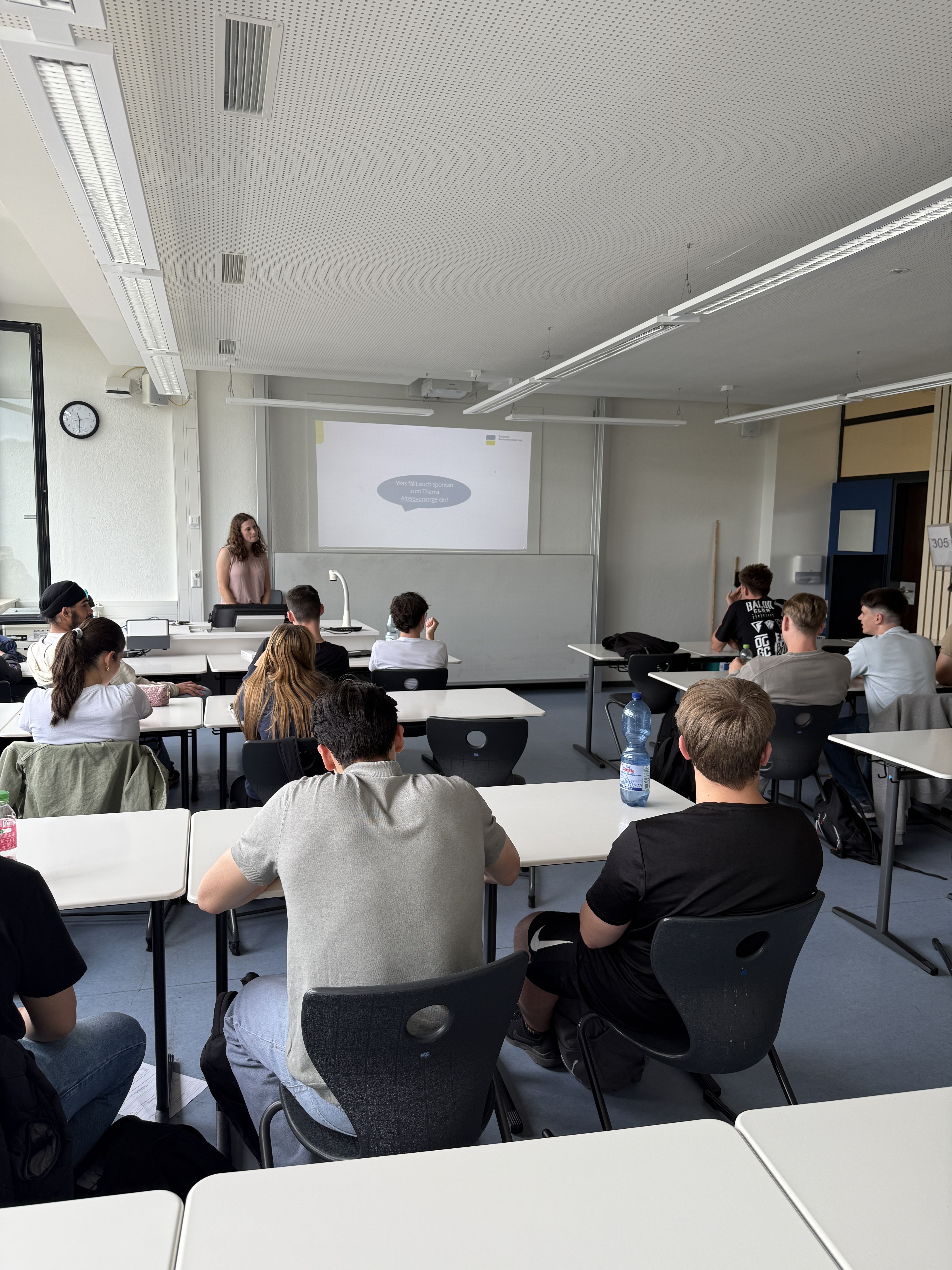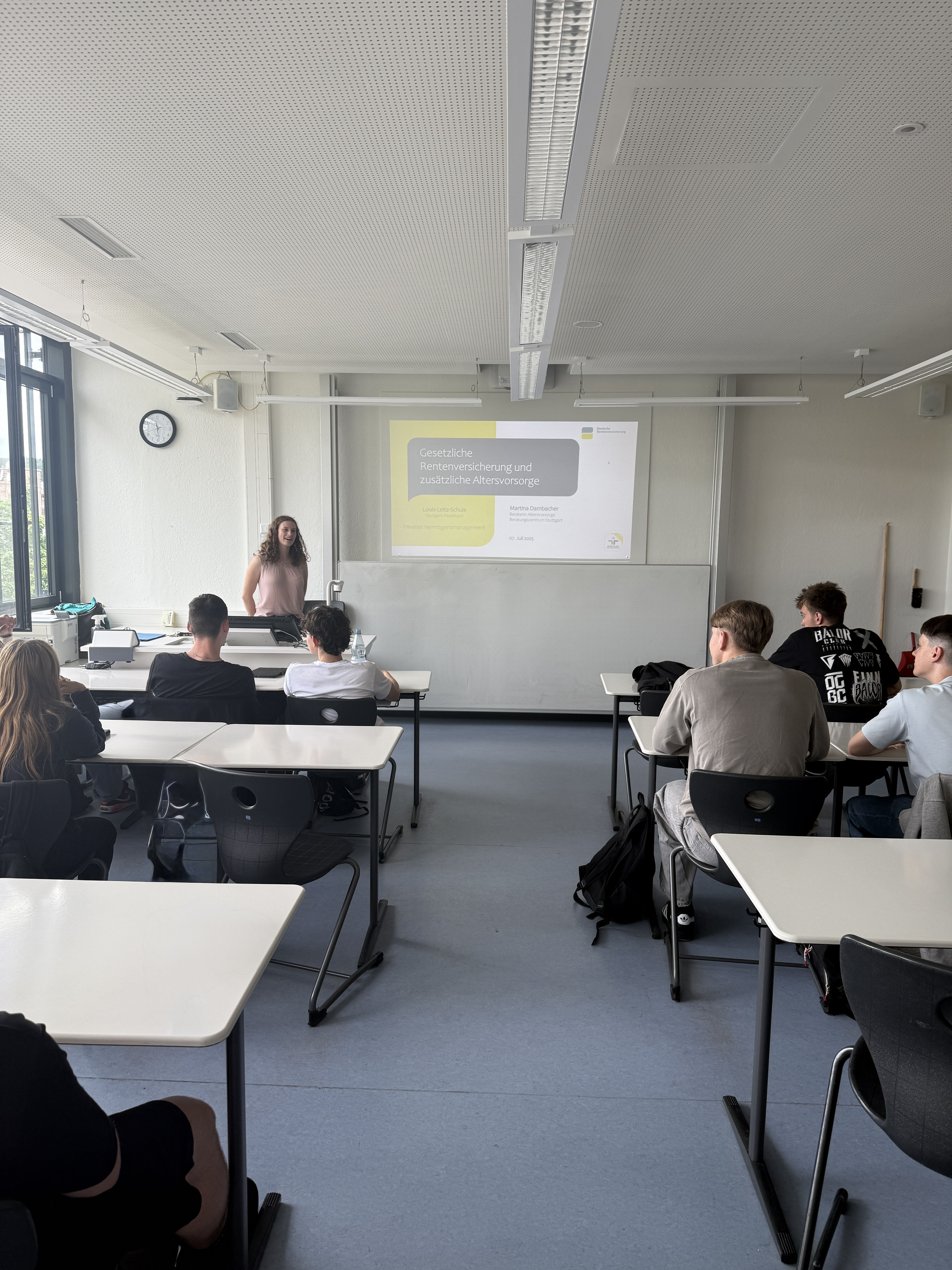 Umso spannender war es, dass Frau Dambacher, (Beraterin Altersvorsorge, Beratungszentrum Stuttgart) von der Deutschen Rentenversicherung, den Unterricht besuchte und direkt aus der Praxis berichtete. Sie erklärte, wie das Rentensystem in Deutschland funktioniert, warum es wichtig ist, frühzeitig vorzusorgen ⏳ – und welche Möglichkeiten es dafür gibt 🧠.