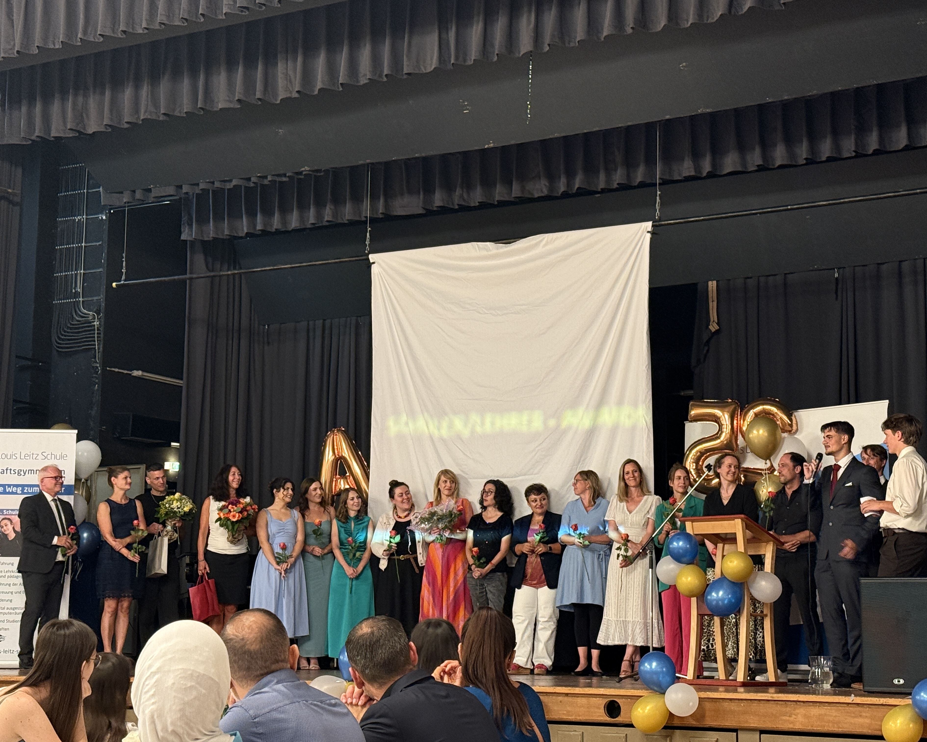 Im Anschluss baten die Abiturklassen alle anwesenden Lehrkräfte auf die Bühne. Es folgte die Übergabe der Lehrergeschenke, bei welcher die Klassenlehrkräfte besonders gewürdigt wurden. Zudem erhielten alle Fachlehrerinnen und -lehrern zum Dank eine orangene Rose überreicht.