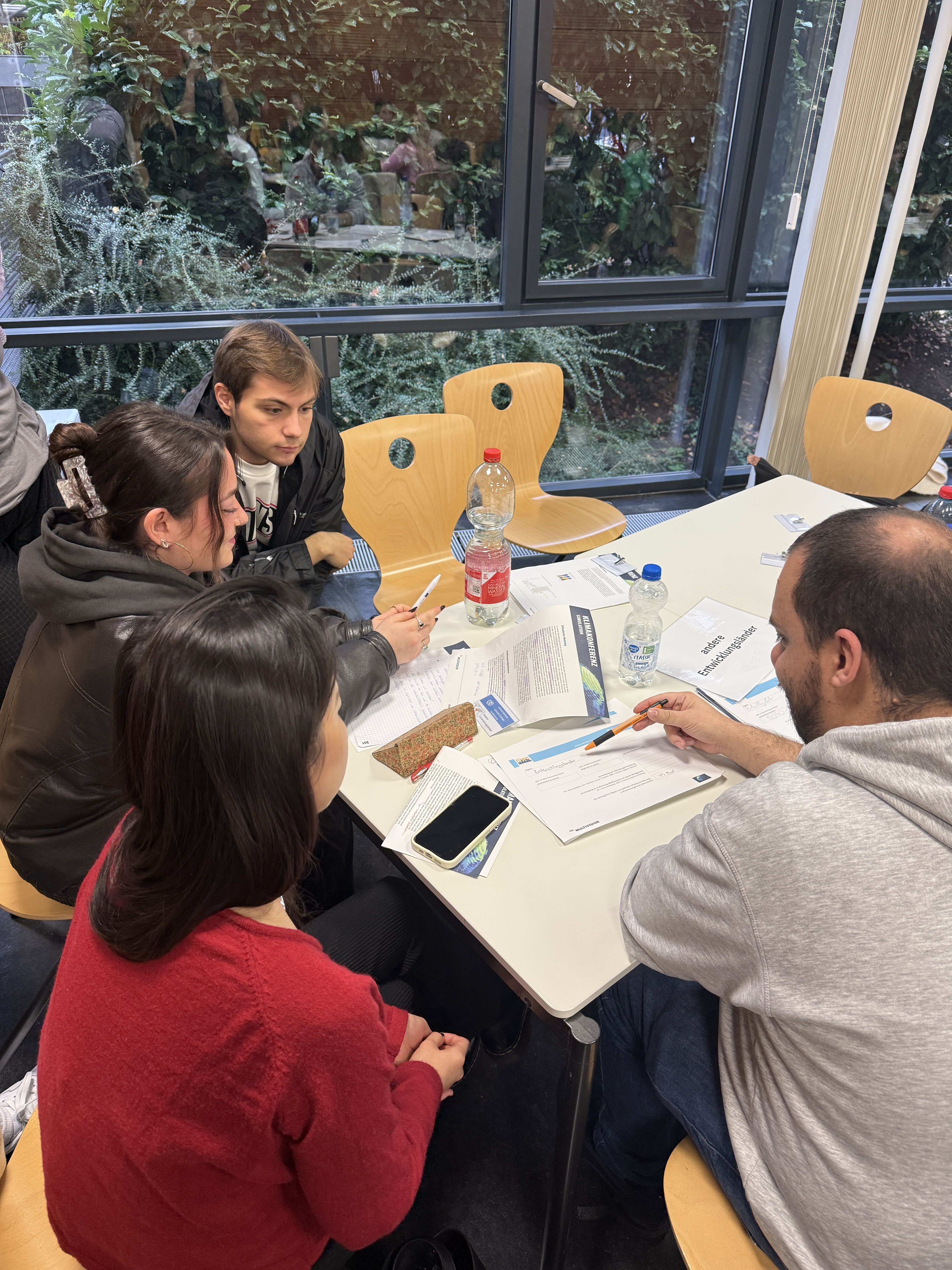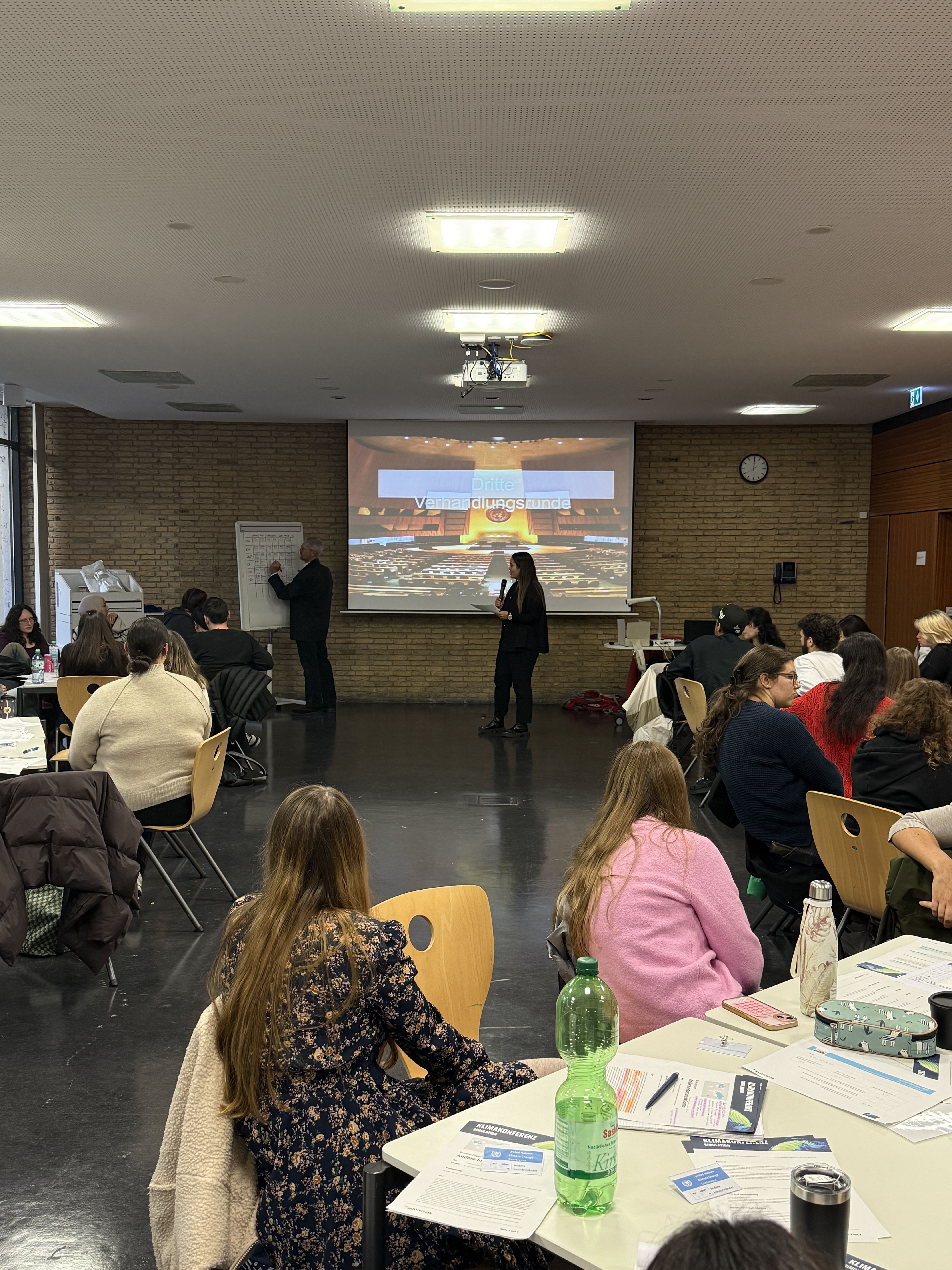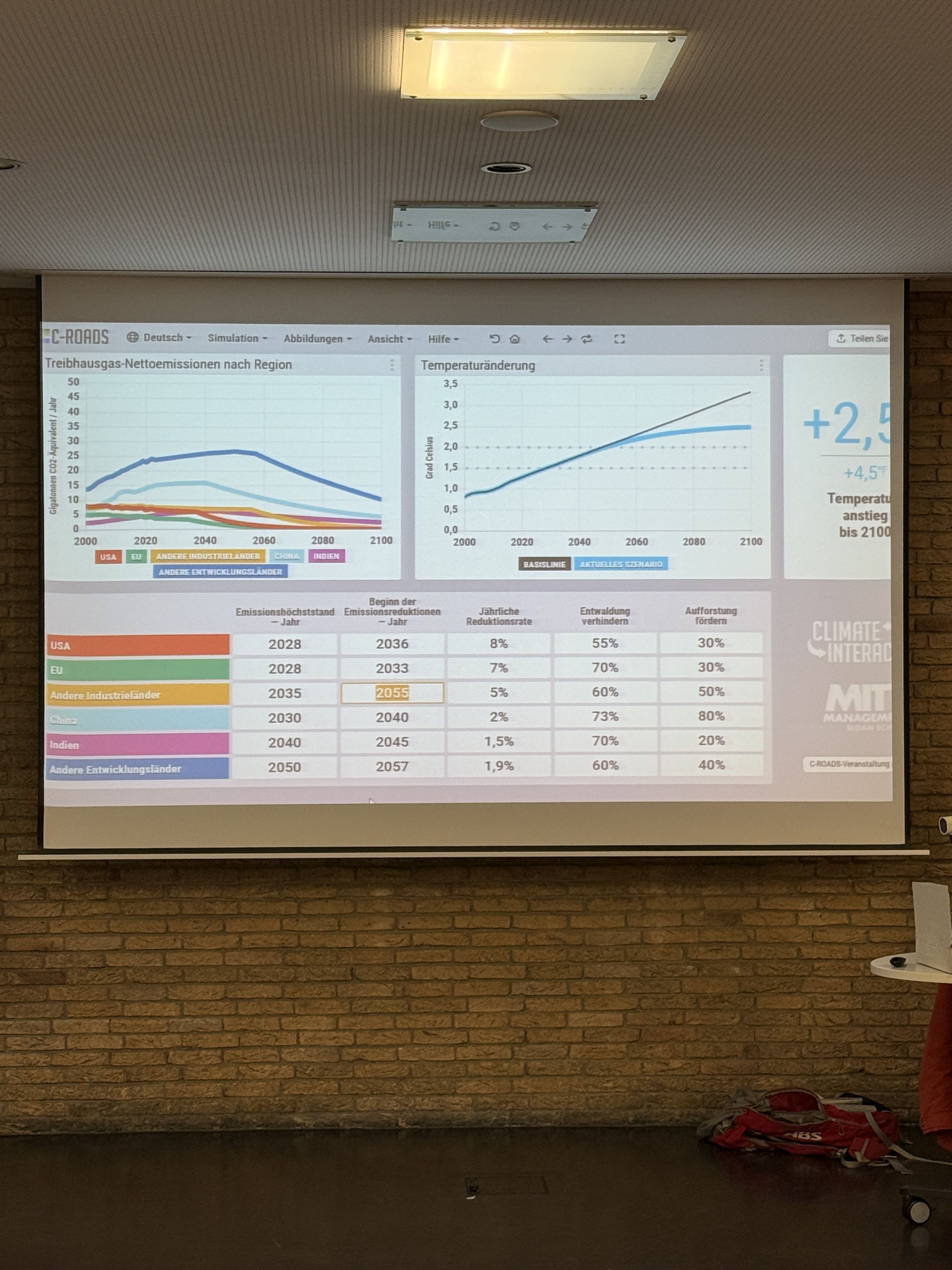 In kleinen Gruppen versuchten wir, gemeinsame Lösungen zu finden, unter anderem, wie finanzielle Unterstützung über den Green Climate Fund 💰 aussehen könnte oder was Länder beitragen können, die wirtschaftlich schwächer aufgestellt sind 🌱. Nach jeder der drei Runden wurden die Ergebnisse in einem speziellen Programm namens C-Roads📊 ausgewertet, das zeigte, wie sich unsere Entscheidungen auf die globale Temperatur auswirken würden 🌡️.
