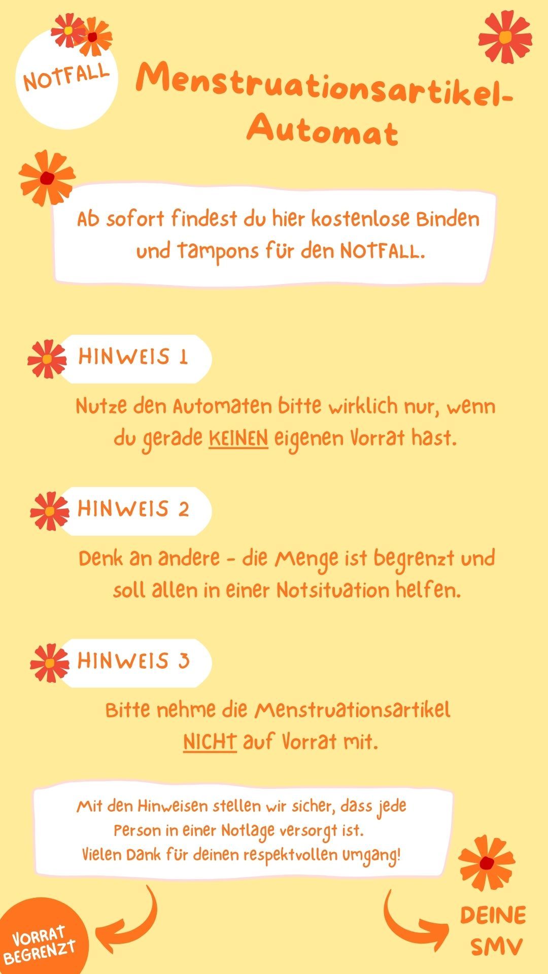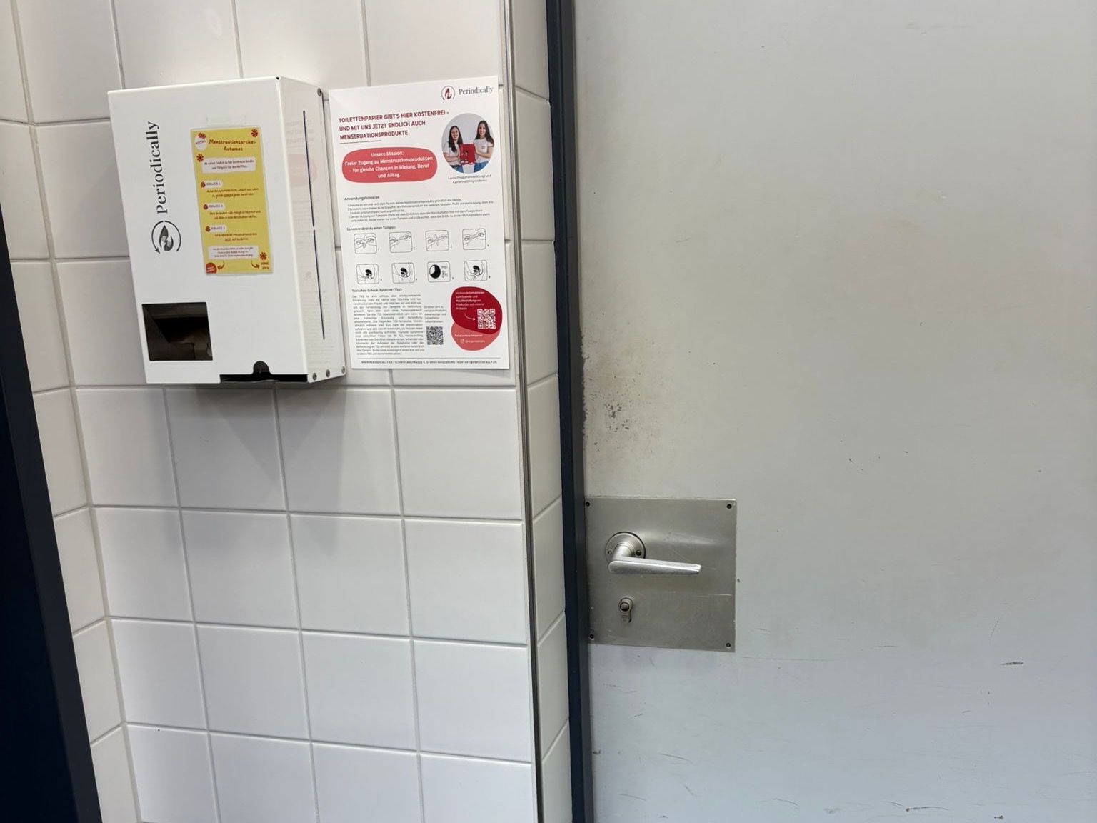 ab sofort gibt es in den Damen- und Unisextoiletten unserer Schule einen Menstruationsartikel-Automaten. Dort findet ihr kostenlose Binden und Tampons, die ihr im Notfall benutzen könnt.