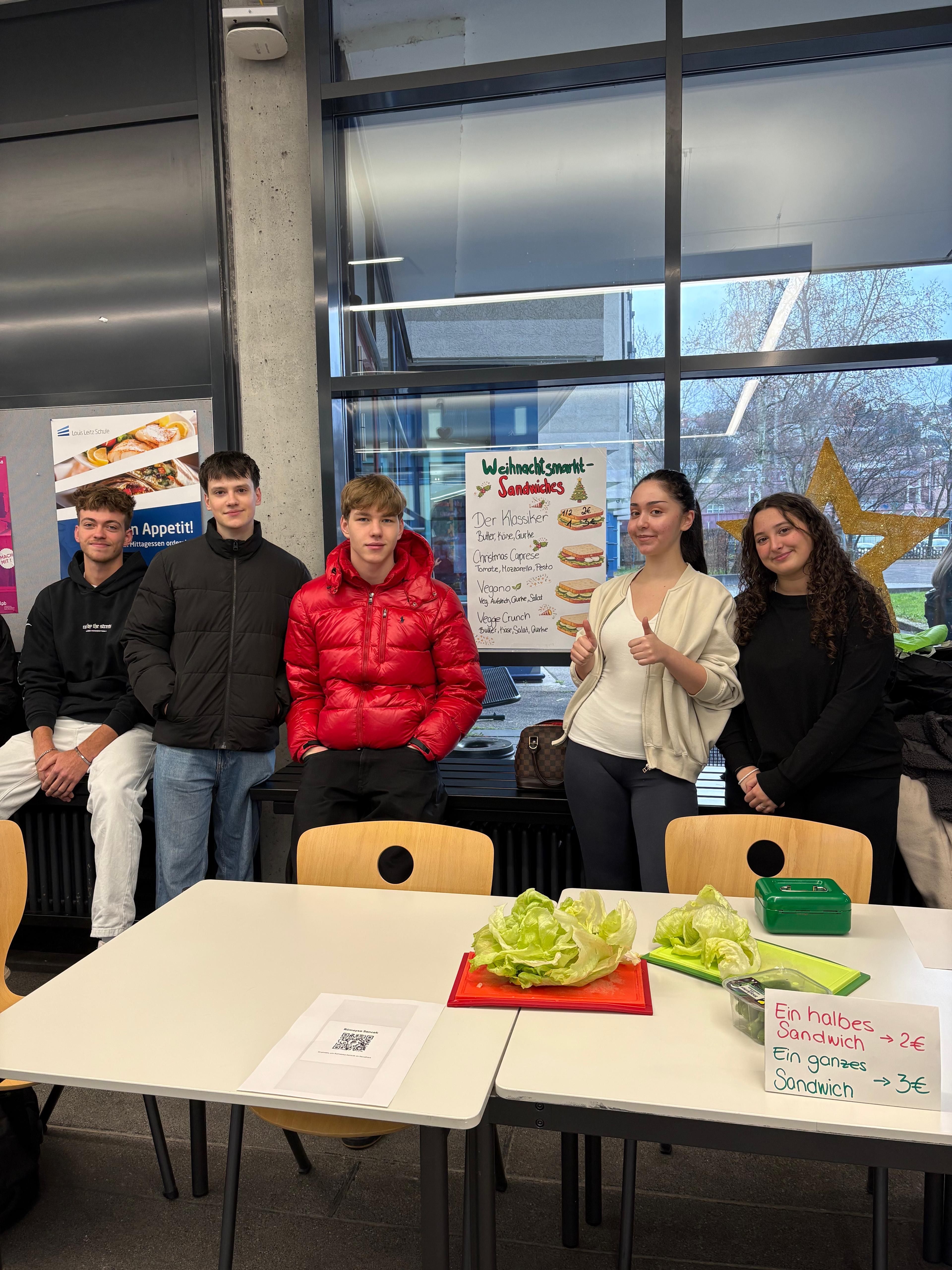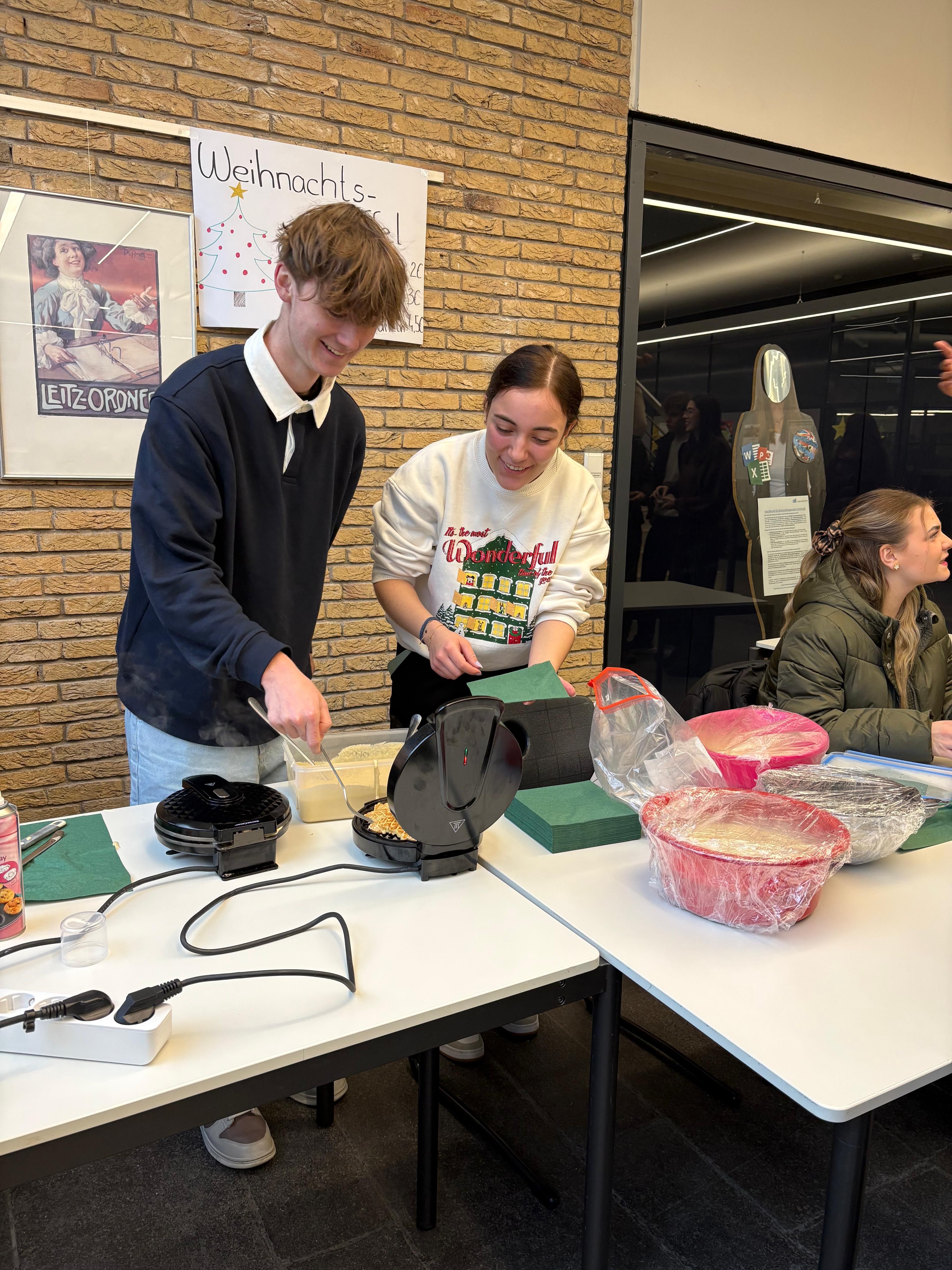 Für das leibliche Wohl sorgten die 12. und 13. Klassen des Wirtschaftsgymnasiums. Angeboten wurden Sandwiches 🥪, frisch gebackene Waffeln 🧇, Hotdogs 🌭 sowie Kinderpunsch und heißer Kakao ☕. Die gut besuchten Stände trugen zur gemütlichen Stimmung bei und boten zugleich Raum für viele schöne Gespräche 💬 und Begegnungen innerhalb der Schulgemeinschaft.