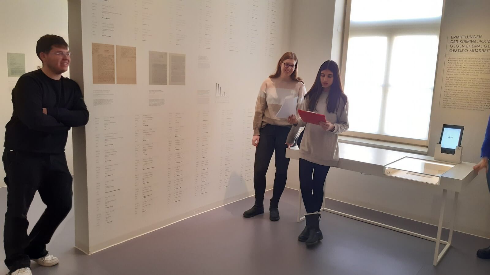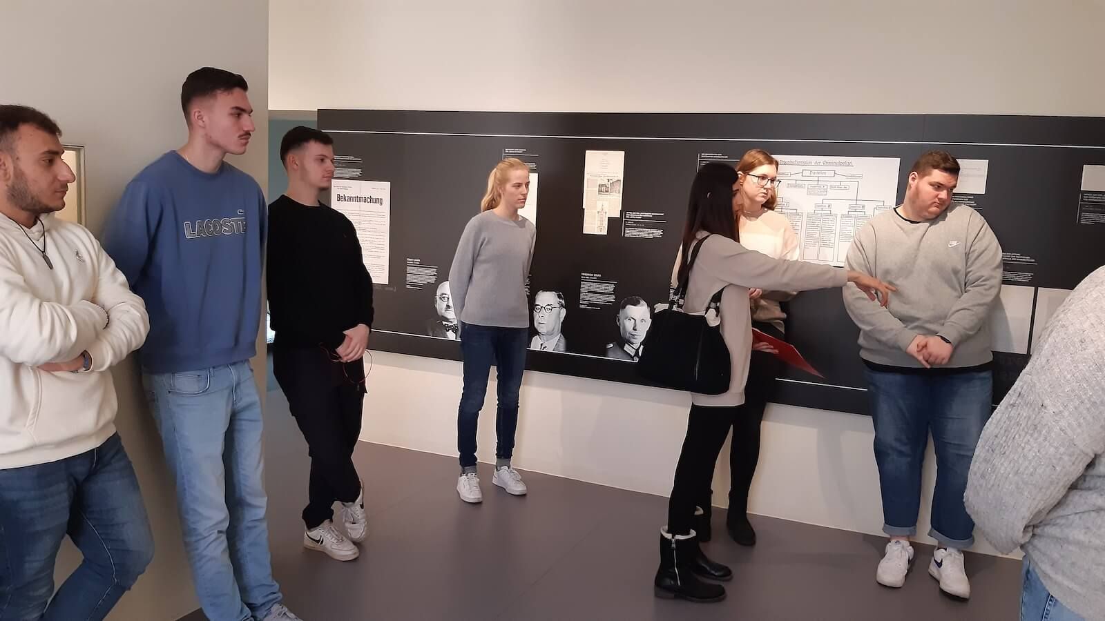 Die Schülerinnen und Schüler bearbeiteten das Thema „Ausgrenzung und Verfolgung“ in einem Workshop anhand von fünf konkreten Tätern und Opfern, an denen die politische und rassische Verfolgung des NS-Staates deutlich wird. „Ich dachte, wir schauen uns hier nur die Ausstellung an, aber es war viel intensiver, weil wir uns mit dem Schicksal einzelner Personen aktiv auseinandersetzten“, äußerte sich Sara zum Workshop.