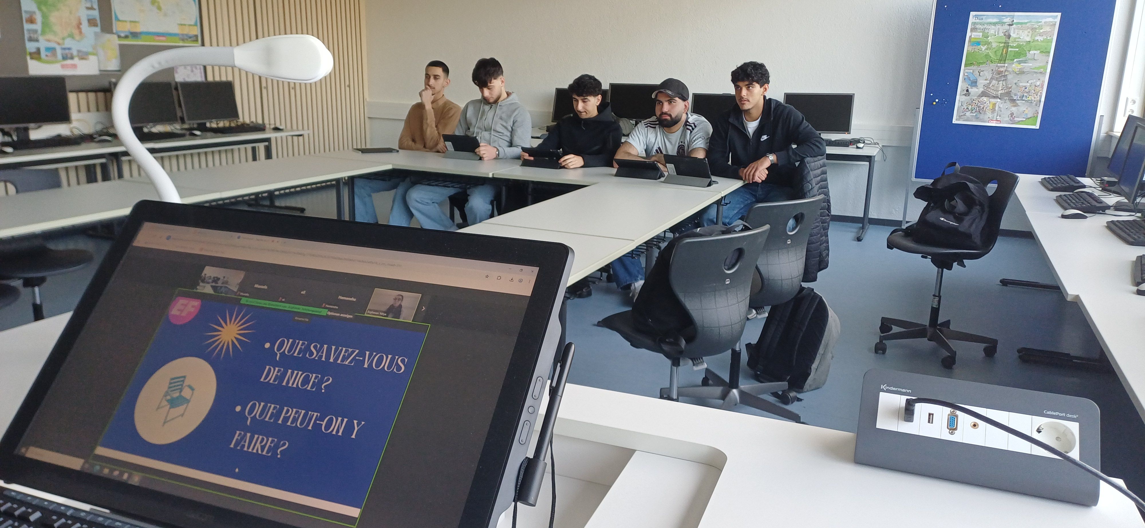Per Zoom schaltete sich eine Lehrerin direkt aus Nizza dazu 🇫🇷 und arbeitete gemeinsam mit den Teilnehmenden auf dem Niveau A1/A2 📚. Dabei drehte sich alles um einen typischen Tag in Nizza.