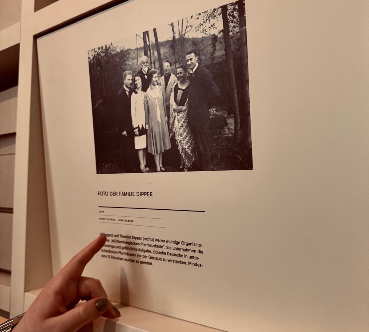 Ein besonders hoffnungsvolles Beispiel ist die Familie Dipper, eine evangelische Pfarrersfamilie. Sie halfen während der NS-Zeit jüdischen Mitbürgerinnen und Mitbürgern, indem sie sie versteckten und so vor Verhaftung und Deportation schützten. Damit setzten sie ihr eigenes Leben bewusst aufs Spiel, da diese Hilfe streng bestraft werden konnte. Ihr Handeln steht für Zivilcourage und Menschlichkeit in einer Zeit von Terror und Verfolgung.